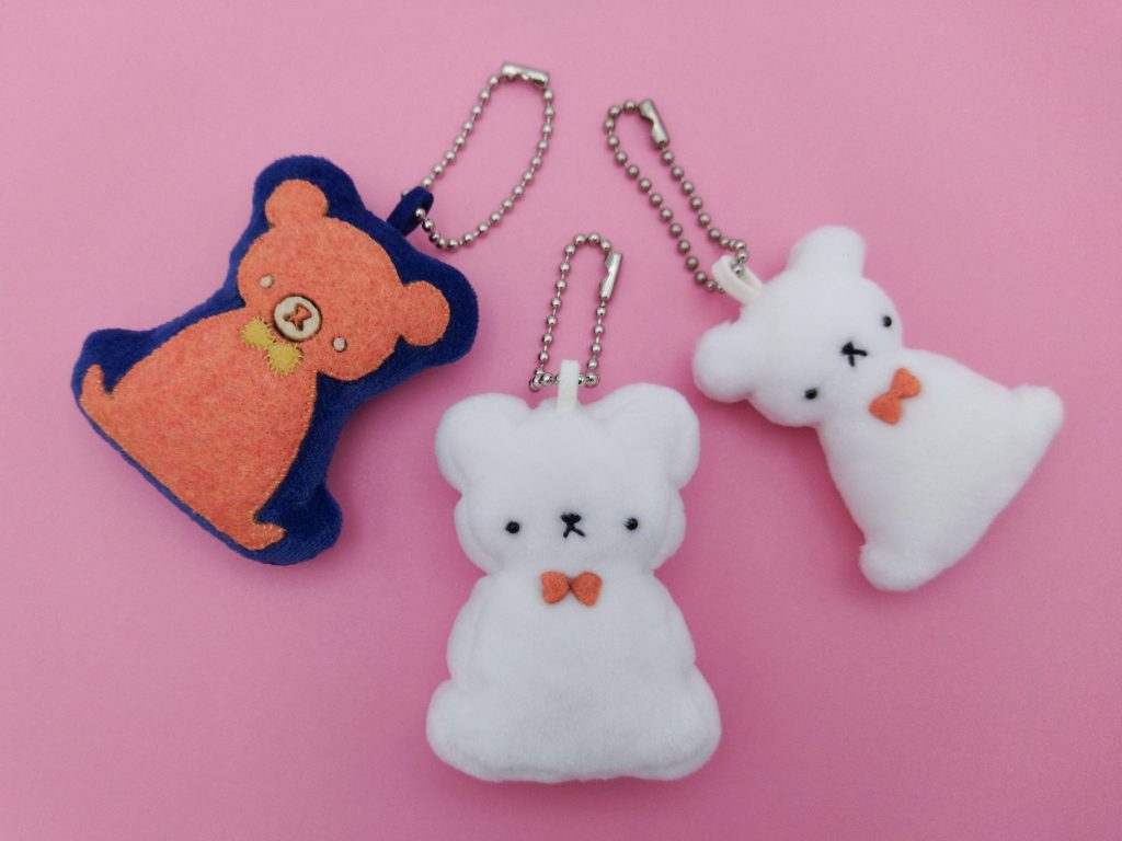 短毛ボア作ったシロクマはモッチモチの手触りで、ずっと触りたくなるキーホルダー。画像左端は、フェルトのクマを別珍に縫いつけたしっかり手触りのキーホルダー。